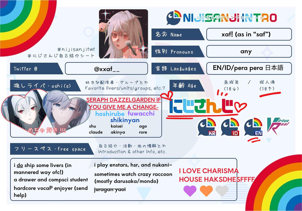 | - art - utaite & vocaloid - game (enstars, proseka, valo) - vtubers (2434, neo porte) - animanga (shonen) - danmei (mxtx, meatbun, priest) - manhwa (orv, solo leveling, return of blossoming blade) - tv shows (marvel, hannibal, sherlock, ofmd) |